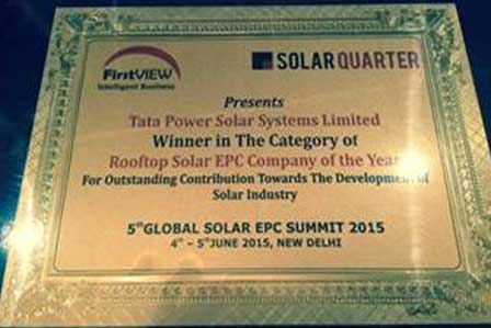 Tata Power Solar won the ‘Rooftop Solar EPC Company’ Award, in the Commercial and Residential projects category, at the Indian Rooftop Solar Summit 2016, instituted by the FirstView group.