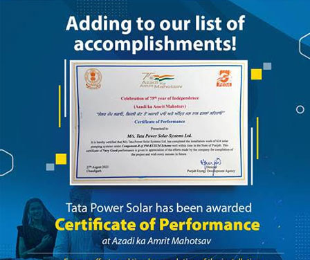 We are happy to announce that Punjab Energy Development Agency (PEDA) has awarded Tata Power Solar with a Certificate of Performance at the Azadi ka Amrit Mahotsav. This certificate is an appreciation towards our excellent performance and efforts displayed while installing 624 solar pumping systems under Component-B of the PM-KUSUM Scheme in Punjab. We are looking forward to doing more in helping India become self-sufficient with respect to energy generation.