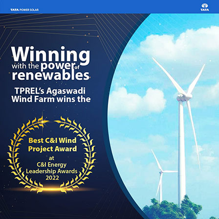 Tata Power Renewables won the “Best C&I Wind Project Award” at the “C&I Energy Leadership Awards 2022”. This esteemed recognition was given to ‘Tata Power Renewable Energy Limited’ for the Agaswadi 49.5 MW Windfarm project, which generated 99.58 MU in FY 22 and had the highest annual PLF (Plant Load Factor) of 22.96% among the other nominees. The glorious event took place at New Delhi on 26th Aug’22. TPREL has 49.5 MW Windfarms situated in Maharashtra State, consisting of 33 Windmills each of 1.5 MW and was commissioned in 2011. C&I Energy India Leadership Awards 2022 is the only event of its kind to recognize excellence across India’s energy efficiency & clean energy sector for Commercial & Industrial units.