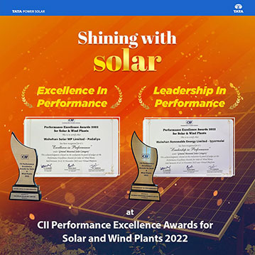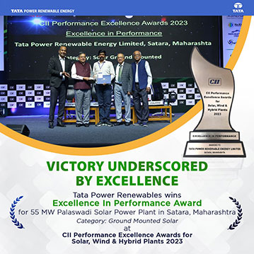 Tata Power Renewables bagged awards in 2 categories under Performance Excellence Awards 2022 by CII. Walwhan Renewable Energy Limited got recognized for its LEADERSHIP IN PERFORMANCE under ‘Ground Mounted Solar Category’ for its 50MW Solar Plant at Iyyermalai, Tamil Nadu and Walwhan Solar MP Limited for its EXCELLENCE IN PERFORMANCE under ‘Ground Mounted Solar Category’ for 25MW Solar Plant at Padaliya, Madhya Pradesh .
