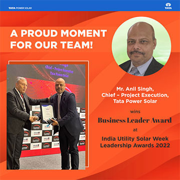Mr. Anil Singh, Chief – Project Execution, Tata Power Solar, has won the Business Leader award at India Utility Solar Week Leadership Awards 2022.