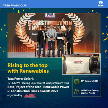 Tata Power Solar has been recognized at the Construction Times Awards for the path-breaking 101.6 MWp floating solar project at Kayamkulam, Kerala, the largest of its kind in India. The award, which acknowledges outstanding contributions in various construction segments, revitalises the renewable energy mission. The Awards has been instituted to honour the outstanding infrastructure projects, professionals and the construction material companies. The award has been given for executing “India’s largest floating solar”, with a capacity of 101.6 MWp, put into operation in Kayamkulam, Kerala on a 350-acre water body, backwaters area.
