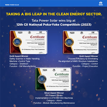 Tata Power Solar bagged three awards for contributing to the field of renewables with their innovative ideas on poka-yoke techniques at the 12th CII National Poka-Yoke Competition. The cell Manufacturing team won Gold Award under Shutdown category for improvement in Safety scanner in Wafer handling machine. Project Execution team bagged Gold Award under Control Category for presenting innovative idea in Process Efficiency by eliminating Re-alignment of MMS Structure Installations. Silver award bagged by Module Manufacturing Maintenance team under Alarm category for improvement in RH Present Sensor Implementation in ATW MS100A Machines.