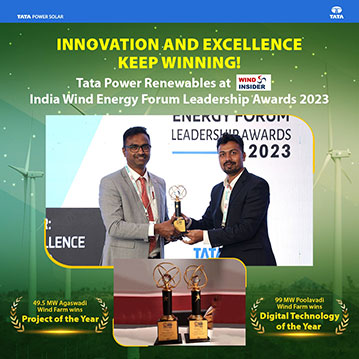 Tata Power Renewables bagged two awards for its Wind projects at Agaswadi and Poolavadi at the prestigious India Wind Energy Forum Leadership Awards 2023 organised by Wind Insider. Agaswadi windfarm won in the category ‘Project of the Year: Performance Excellence’ from the ‘Wind-Insider for the Best performance in FY 23 for achieving Higher generations’ and Poolawadi windfarm in the category ‘Digital Technology of the Year: Big Data, IT & Analytics’ from the ‘Wind-Insider for the Transformer Remote monitoring system’.