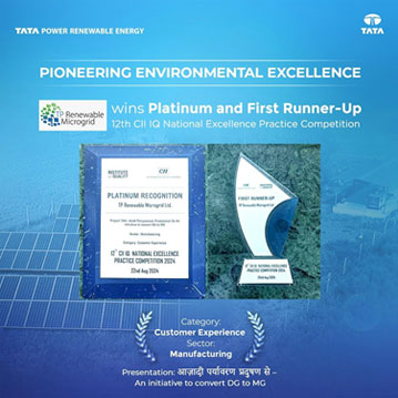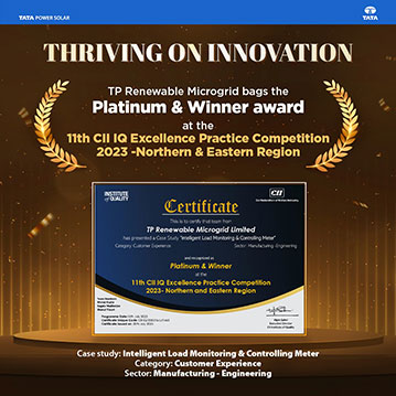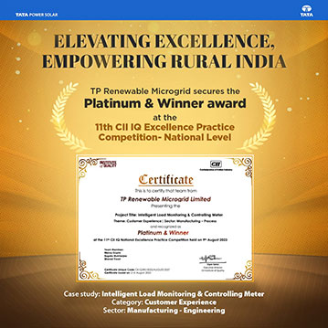 TP Renewable Microgrid has been awarded the Platinum and Winner at the prestigious 11th CII IQ Excellence Practice Competition on a national level. The award resonates with our innovative approach in serving rural microgrid consumers through the implementation of the patented Load Monitoring & Controlling Group Meter. This pioneering solution has been recognized for the groundbreaking innovation in enhancing Customer Experience and Manufacturing – Engineering sectors. This achievement further propels our commitment to empower the rural communities, elevate their quality of life, and actively contribute to the nation’s sustainable development goals.