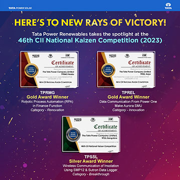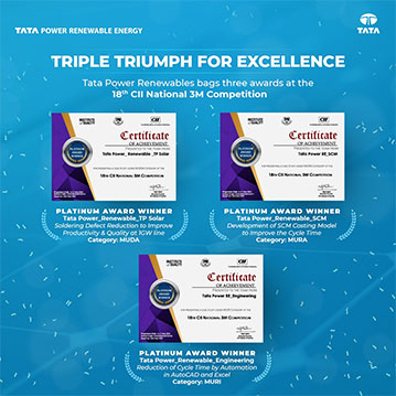 Tata Power Renewables has bagged three platinum awards at the CII National 3M Kaizen competition. TP Solar has been recognized under the 3M MUDA category for its project on Soldering Defect Reduction to Improve Productivity & Quality at the 1GW line. Additionally, team SCM received the accolade under the 3M MURA category for developing a SCM Costing Model that improved cycle time from 10 days to just 1 day. The Tata Power Renewables Engineering team was honored in the MURI category for their work on reducing cycle time by automating processes in AutoCAD and Excel. Such accolades highlight Tata Power Renewables commitment to continuous improvement and technological advancement, pushing the boundaries of innovation.