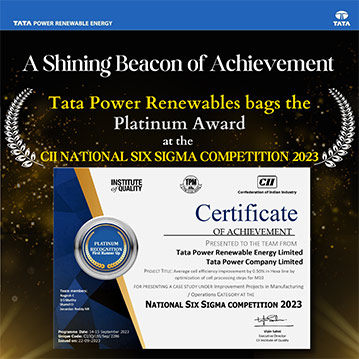 Tata Power Renewables demonstrated its unwavering commitment to excellence and innovation by clinching the prestigious Platinum Award at the CII Six Sigma Awards 2023. The recognition was conferred in the Manufacturing category for their groundbreaking project, titled “Average Cell Efficiency Improvement by 0.50% in Hexa Line Through Optimization of Cell Processing Steps for M10.” This remarkable achievement underscores Tata Power Renewables’ dedication to continuous improvement and cutting-edge technology, contributing to a more sustainable future by enhancing solar cells and modules efficiency. It is a testament to company’s relentless pursuit of excellence in the renewable energy sector, setting new industry standards in the process.
