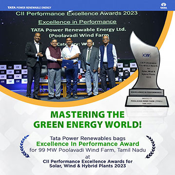 Tata Power Renewables won the prestigious Excellence In Performance Award at CII Performance Excellence Awards for Solar, Wind & Hybrid Plants 2023 for its 99MW, Poolavadi Wind Farm. Since its commissioning in 2011 in Tamil Nadu, the wind farm has consistently demonstrated commendable annual generation, efficient operations and maintenance practices, and effective cost management, all while adhering to industry best practices. This well-deserved recognition serves as a testament to the collaborative efforts dedicated to maintaining high plant and grid availability, showcasing a commitment to excellence and contributing to the continuous improvement of the wind farm’s overall performance.