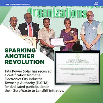 Tata Power Solar felicitated with a certification from ELCITA for the company’s active involvement in their Zero Waste to Landfill initiative through commendable waste management processes. The waste collected from Tata Power Solar Systems Ltd. since November 01, 2023, has been recycled via ELCITA’s Sustainability Park, Electronics City, Bangalore.