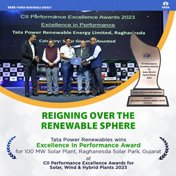 Tata Power Renewables bagged the Excellence In Performance Award for the 100 MW Solar Plant in Raghanesda Solar Park, Gujarat at CII Performance Excellence Awards for Solar, Wind & Hybrid Plants 2023. Despite facing challenges such as geographical constraints, water availability, and manpower issues, the plant has consistently excelled at benchmark levels. This success is attributed to the implementation and adoption of advanced analytical tools for plant performance analysis, along with the dedication of the site team. Such accolades underscore our significant contribution to green goals.