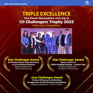 Tata Power Renewables bagged 3 awards at prestigious CII Challengers Trophy 2023 (Poka Yoke Competition). The manufacturing department won Star Challenger award under shutdown category for Safety scanner in Wafer handling machine – Control Type and Star Challenger award under Alarm category for RH Present Sensor Implementation in ATW MS100A Machines. Project department received Jury Challenger award under Control Category for Process Efficiency by eliminating Re-alignment of MMS Structure Installations.