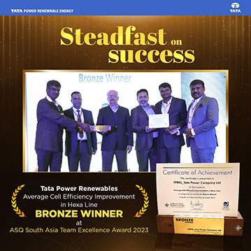 Tata Power Renewables has achieved a significant milestone by receiving the Bronze award at the prestigious American Society for Quality, South Asia Team Excellence Award 2023. The awarded project focused on Average Cell Efficiency Improvement in the Hexa Line, showcasing our dedication to cutting-edge technology within the renewable energy sector. This accomplishment marks a significant stride towards a more sustainable future, underscoring the company’s dedication to advancing technology in the realm of renewable energy. By enhancing the efficiency of solar cells and modules, Tata Power Renewables is playing a pivotal role in shaping a more sustainable future.