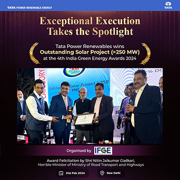 Tata Power Renewables continues to lead the way in the clean energy transition, securing multiple accolades at the CII Energy Excellence Awards 2024. We are proud to have been recognized across solar and wind categories, receiving awards in the Rooftop Solar Performance category, Excellence in Rooftop category, and Leadership in Ground-mounted Solar category. In the wind energy sector, we have been honored with the CII Outstanding in Performance award for Wind O&M Category and the CII Leadership in Performance award in Wind O&M category. This recognition highlights our commitment to delivering high-performance renewable energy projects and driving sustainable growth. As we accelerate India’s green energy transformation, these awards reinforce our dedication to innovation, efficiency, and operational excellence in the renewable sector.