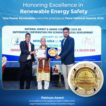 Tata Power Renewable Energy Limited – Large Projects (Central, Western & South Region) has been honored with the prestigious Platinum Award at the FAME National Awards 2024 for Excellence in Occupational Health & Safety (OHS) in the Renewable Energy Industry. This recognition underscores our unwavering commitment to maintaining the highest standards of safety, health, and well-being across our project sites. The award was presented at the National Summit & Award Ceremony 2024 on Outstanding Contribution for Economic & Social Development, reinforcing our dedication to fostering a safe and sustainable work environment. At Tata Power Renewables, we continue to drive operational excellence by prioritizing workplace safety, ensuring the well-being of our workforce, and setting new benchmarks in the renewable energy sector.
