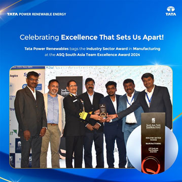 Tata Power Renewables has been awarded the prestigious Industry Sector Award in Manufacturing at the ASQ South Asia Team Excellence Awards 2024. This recognition celebrates our relentless pursuit of quality and innovation, particularly through our project on improving average cell efficiency in the Hexa Line. This achievement represents a significant milestone in advancing solar technology and optimizing manufacturing excellence. By continuously refining our processes and leveraging innovation, we remain committed to driving efficiency and contributing to a cleaner, more sustainable energy future.