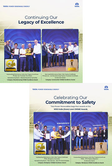 Tata Power Solar has won in the Workplace OHSE Excellence category at the 2nd edition of the prestigious World Safety Organisation-India (State) Level OHSE Awards 2023 for outstanding performance in manufacturing and construction sectors. The Manufacturing unit, Bengaluru, Karnataka and 1 GW SJVN site, Bikaner, Rajasthan won Outstanding Performance, Gold 4 Star awards. 4GW Modules and 4GW Cells Manufacturing Plant, Tamil Nadu bagged Very Good Performance, Silver 3 Star award. The awards will be presented at the 4th Annual WSO-INDIA OHS&E Professional Development Symposium in Chennai.