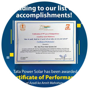 We are happy to announce that Punjab Energy Development Agency (PEDA) has awarded Tata Power Solar with a Certificate of Performance at the Azadi ka Amrit Mahotsav. This certificate is an appreciation towards our excellent performance and efforts displayed while installing 624 solar pumping systems under Component-B of the PM-KUSUM Scheme in Punjab. We are looking forward to doing more in helping India become self-sufficient with respect to energy generation.